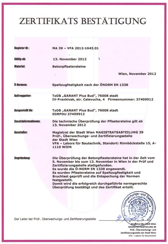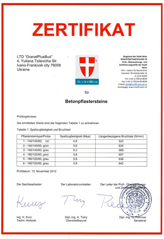 Наше виробництво обладнане німецьким устаткуванням Zenith. Для виготовлення наших виробів ми використовуємо високоякісні матеріали такі як: гранітний щебінь, цемент марки 500 та німецькі барвники Bayer.