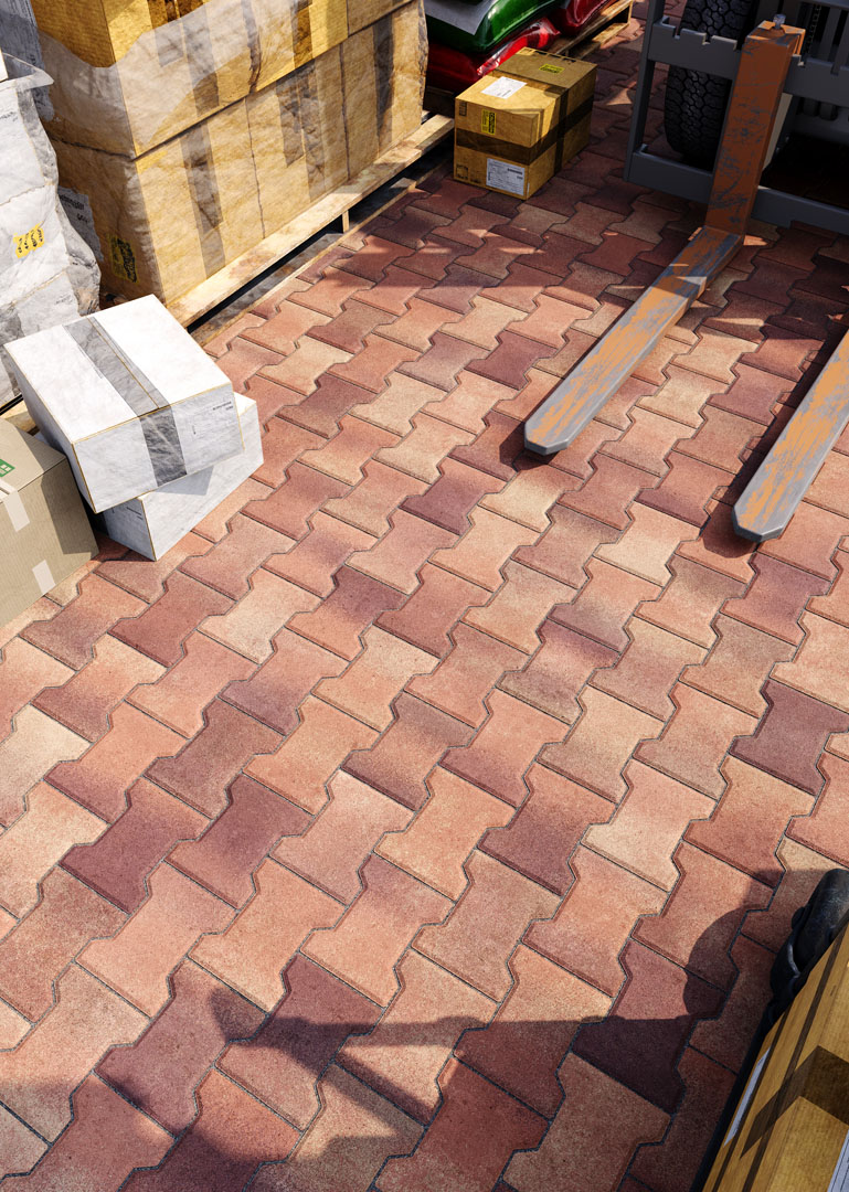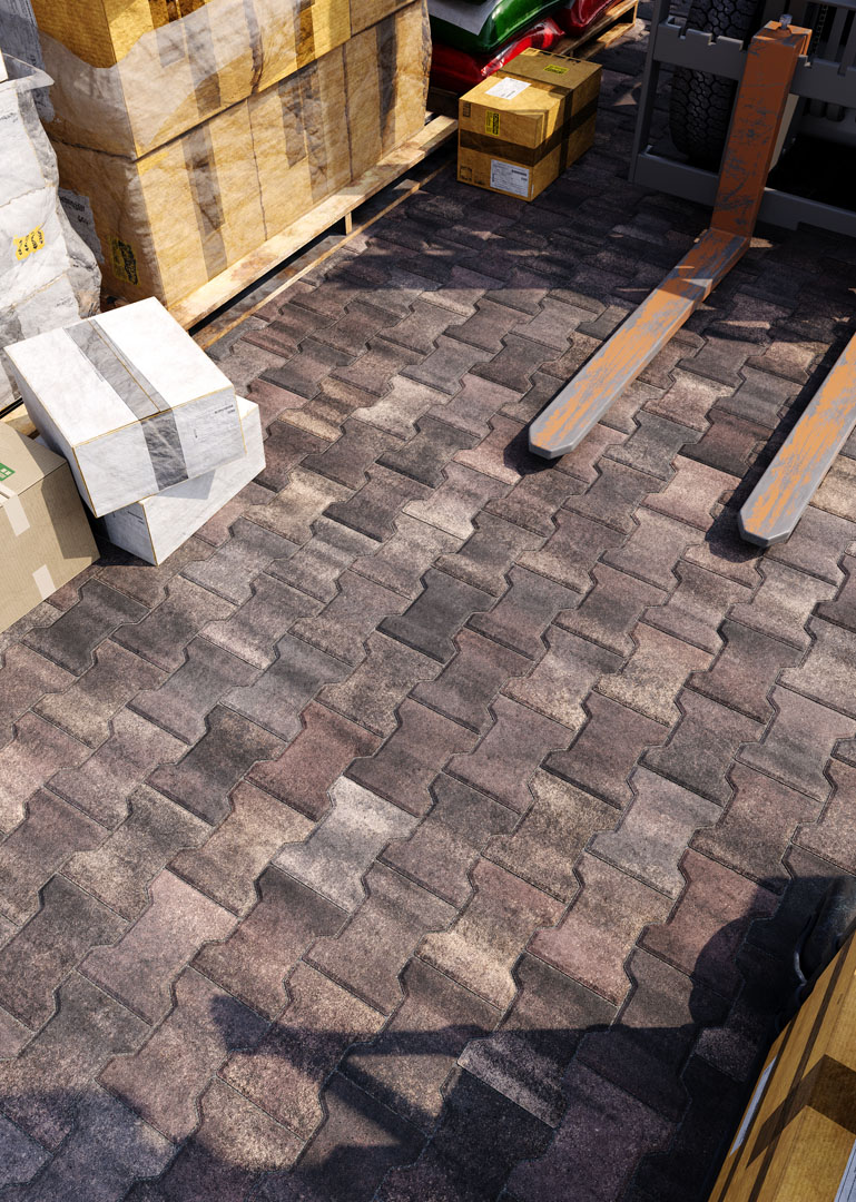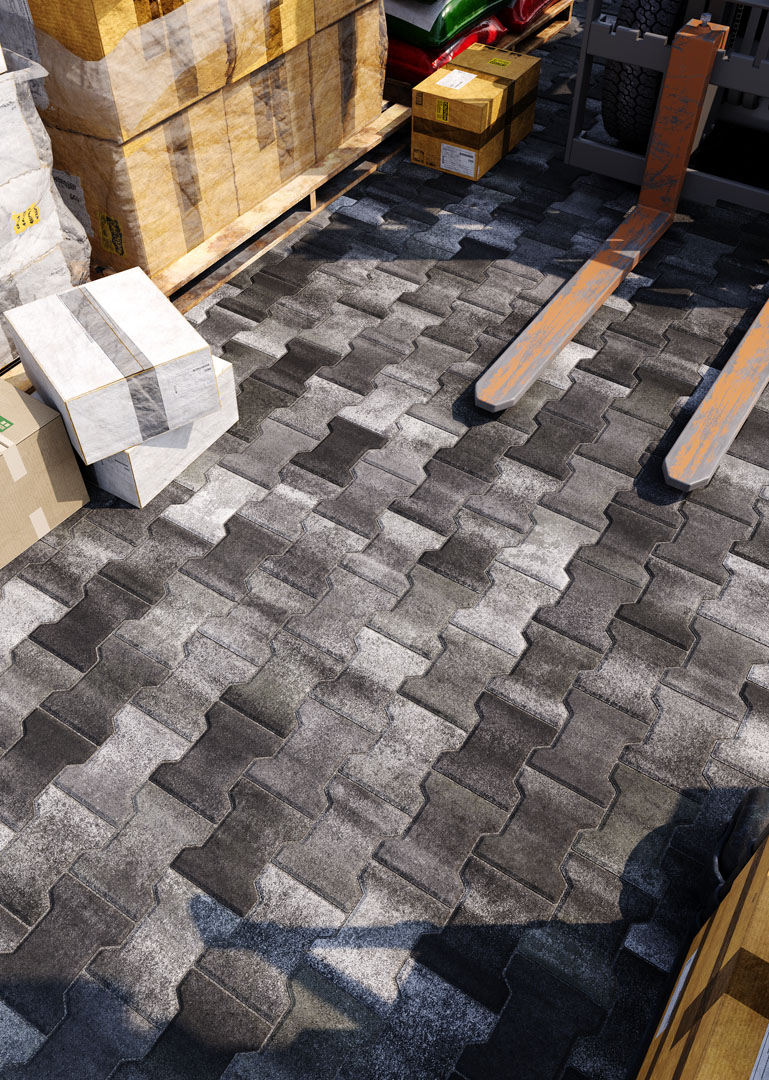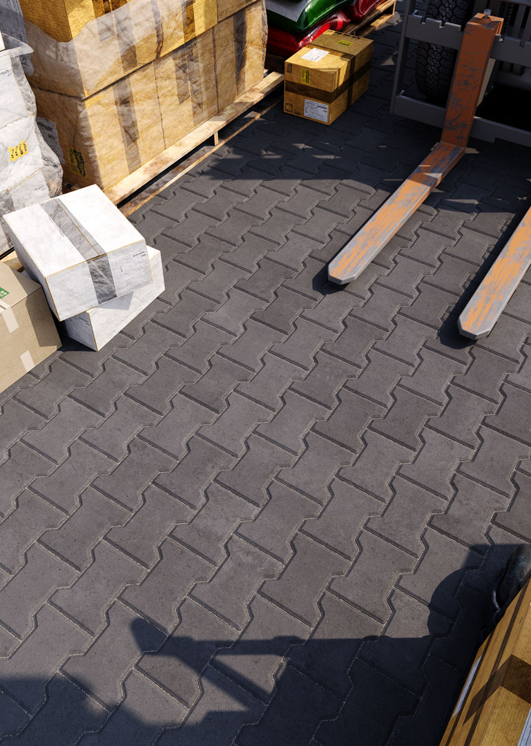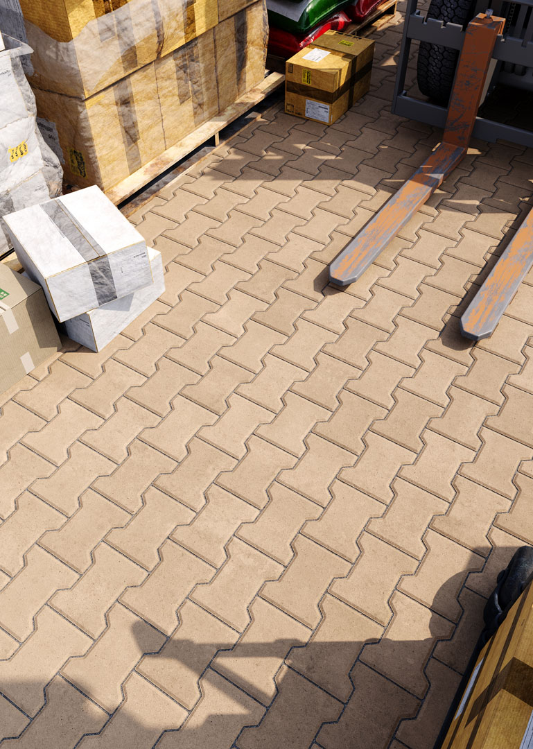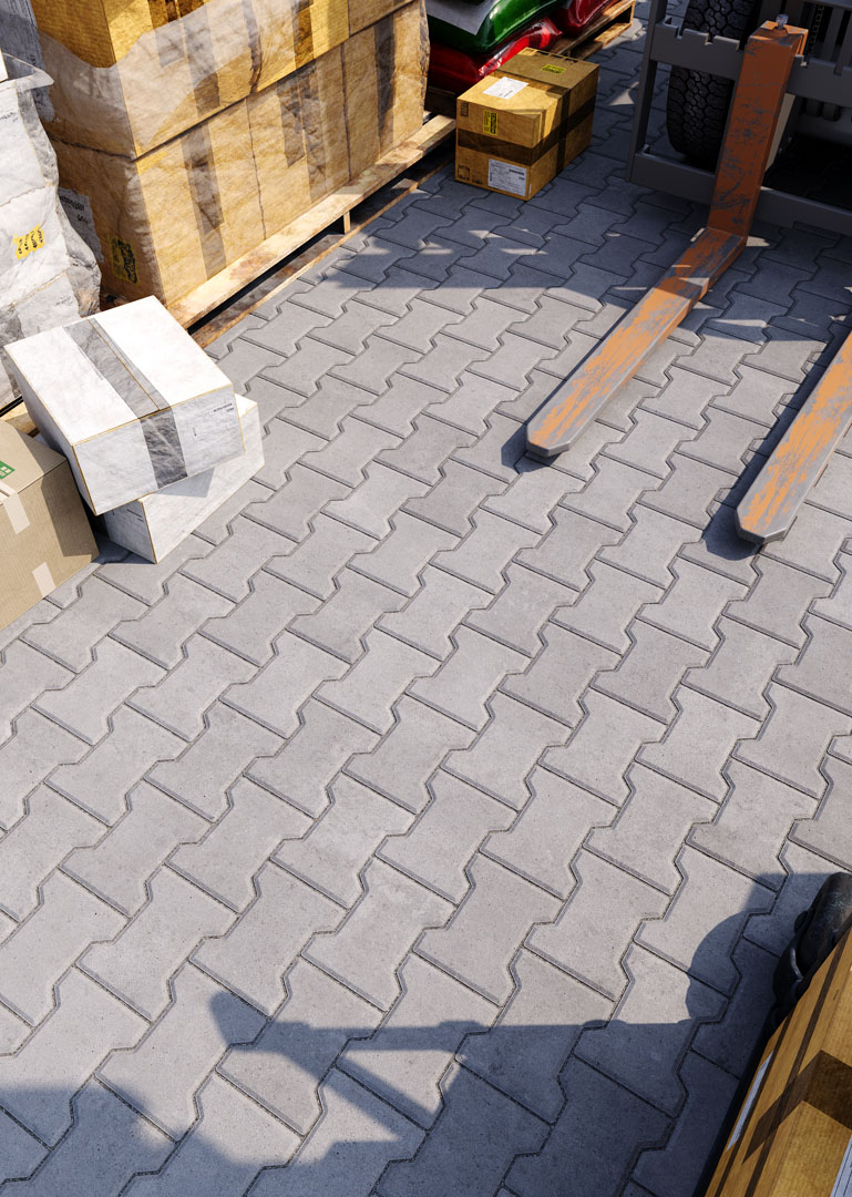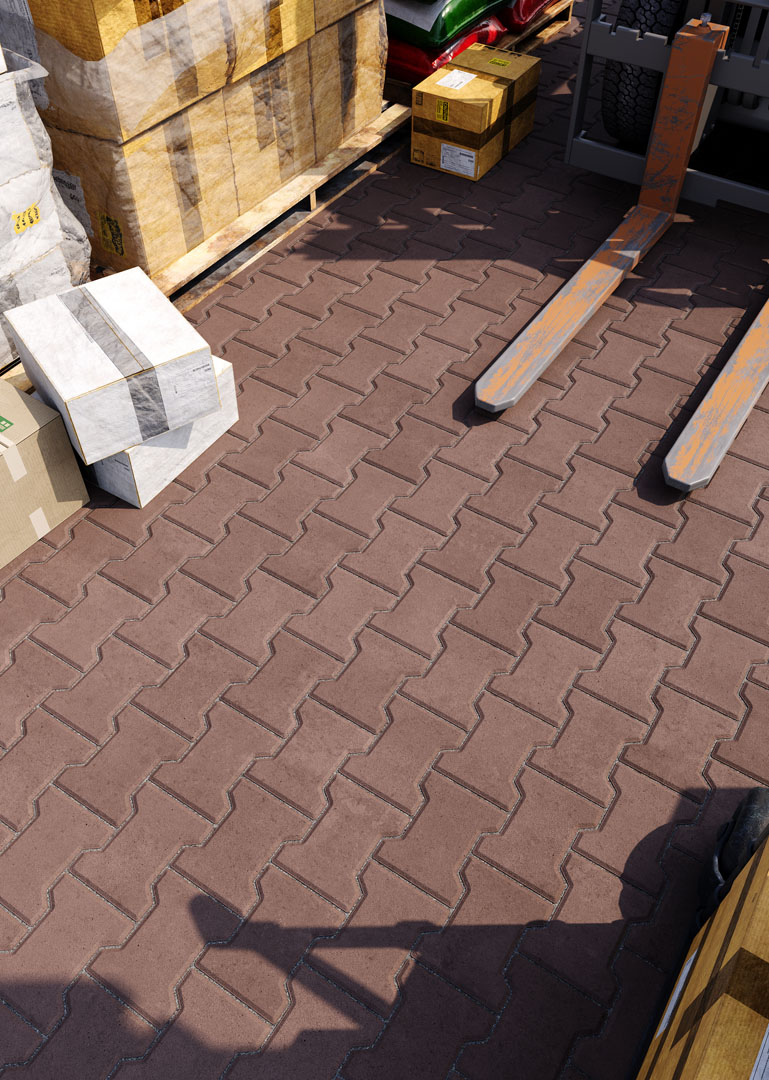 Бруківка “Гантель” справді має гантелеподібну або ж Т-подібну форму. Такий дизайн під час укладання створює ефект пазлу і забезпечує міцне зчеплення плиток. Саме тому ця бруківка – відмінний варіант для зон з високим навантаженням: промислових територій, логістичних центрів, АЗС, автомагістралей тощо.