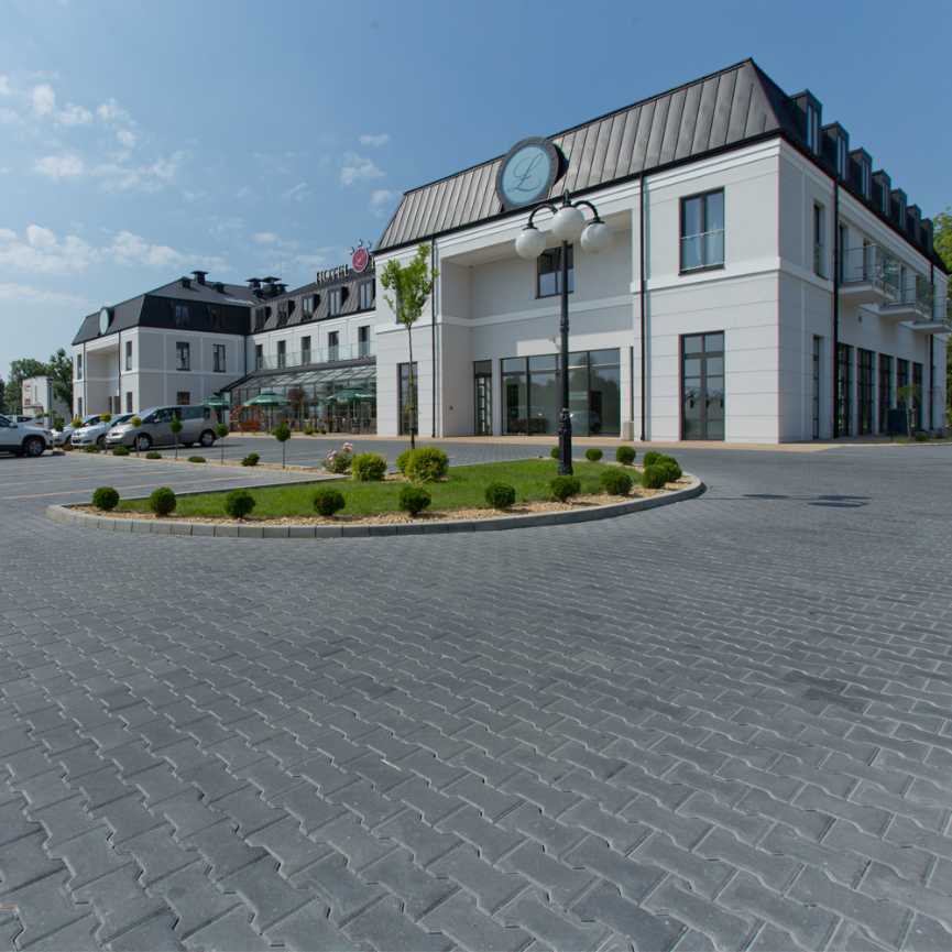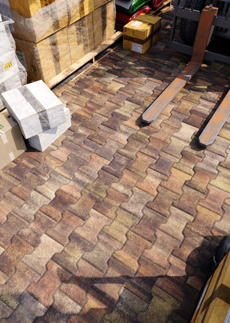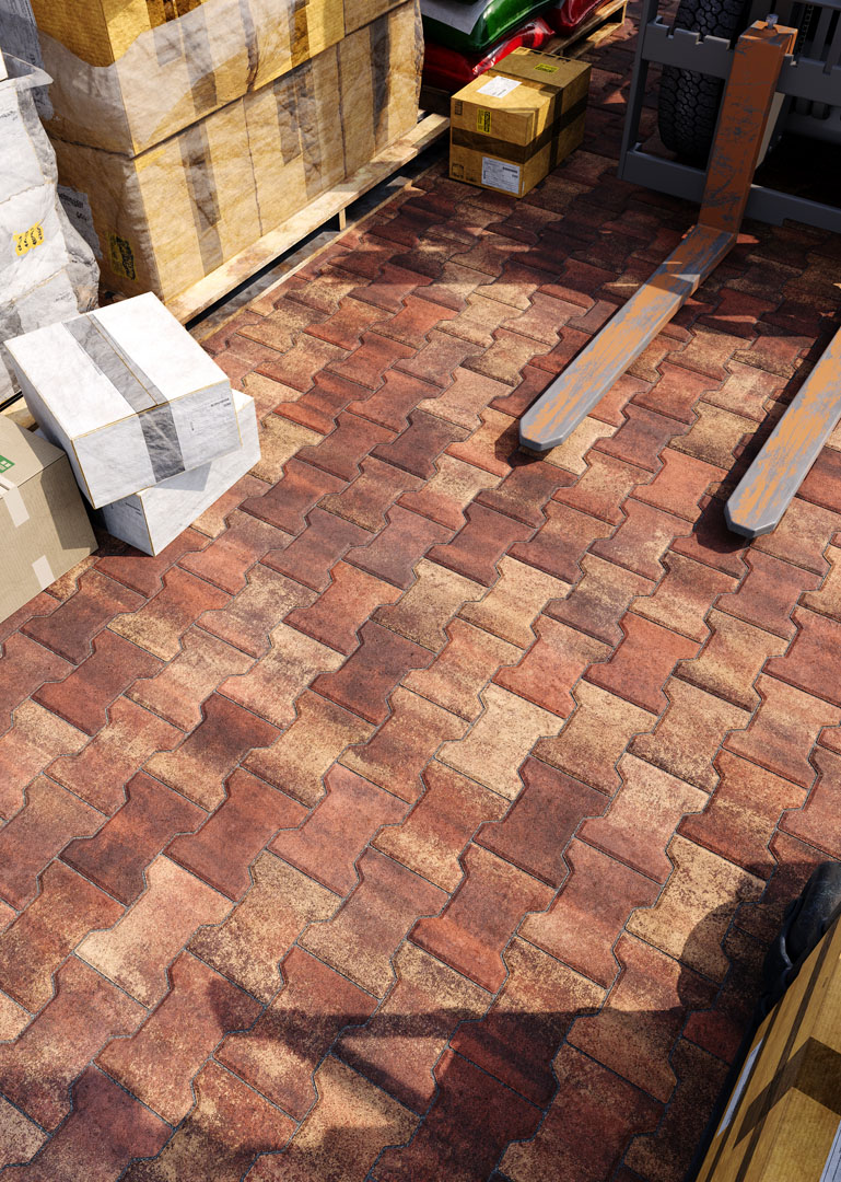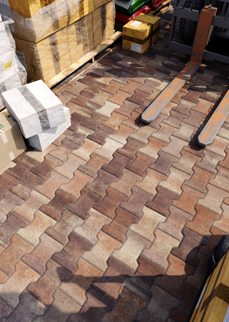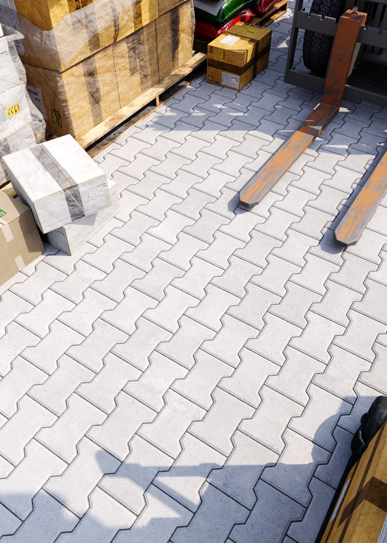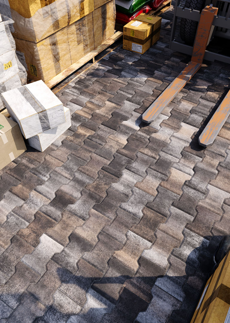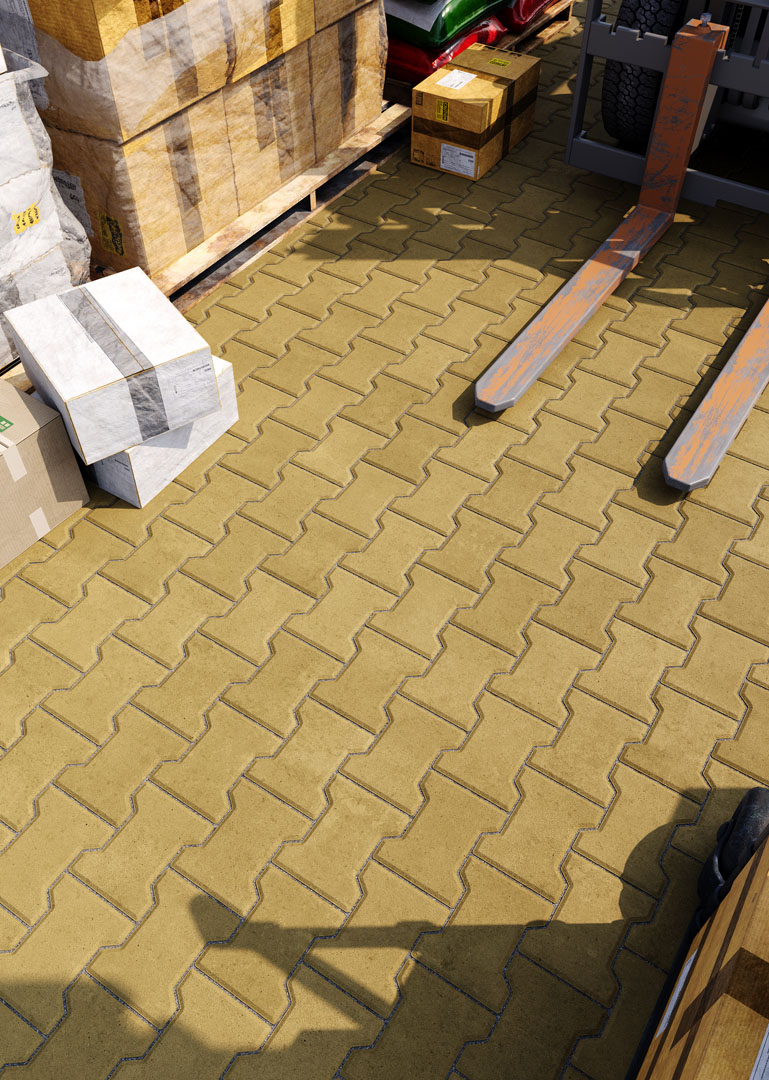 Бруківка “Гантель” справді має гантелеподібну або ж Т-подібну форму. Такий дизайн під час укладання створює ефект пазлу і забезпечує міцне зчеплення плиток. Саме тому ця бруківка – відмінний варіант для зон з високим навантаженням: промислових територій, логістичних центрів, АЗС, автомагістралей тощо.